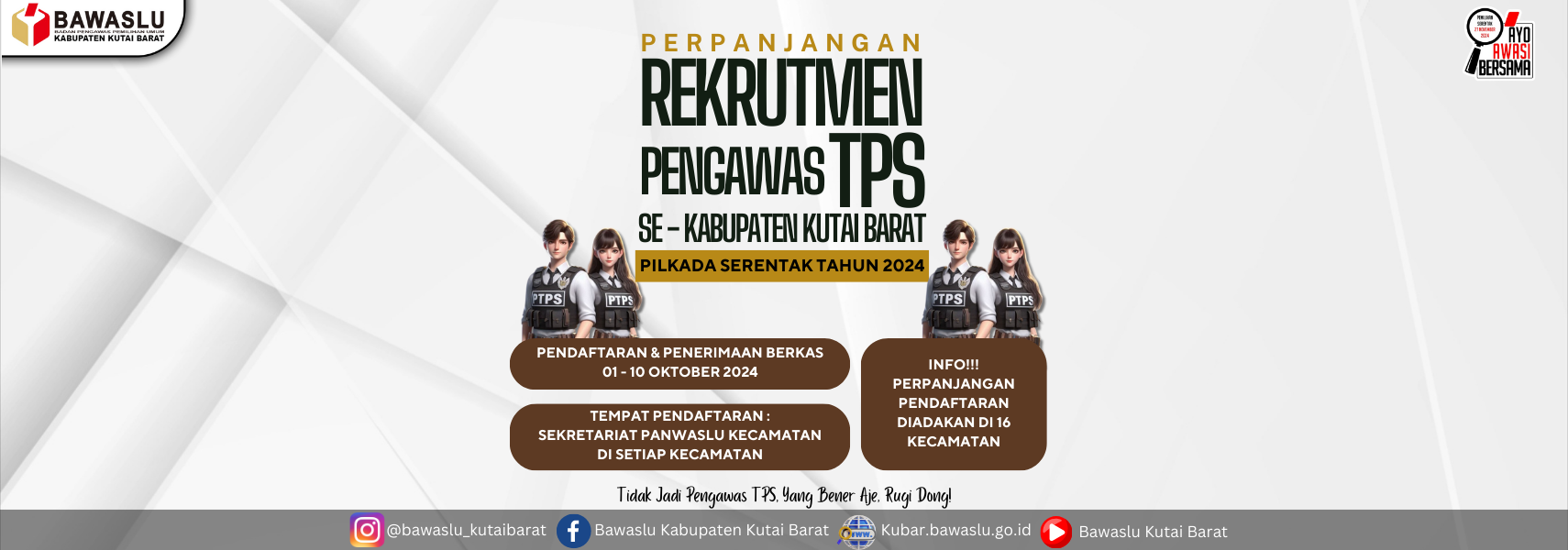 Pengumuman Perpanjangan Rekrutmen Pengawas TPS 01 s.d 10 Oktober 2024 Lihat Selengkapnya Lapor Pelanggaran Pemilu Hasil Pengawasan Tahapan Pemilu 2024 Ajukan Permohonan Sengketa Proses Pemilu Bagaimana Cara Ikut Awasi Pemilu Lapor Hoaks Pemilu Apa Saja Yang Diawasi Pada Tahapan Pemilu Berita Bawaslu Kutai Barat Raih Predikat Terbaik II Badan Publik Informatif Se-Kaltim Tahun 2025 humas Jumat, Oktober 3, 2025 - 12:14 Awasi Hak Pilih, Bawaslu Kutai Barat Ikuti Rekapitulasi PDPB Triwulan III Tahun 2025 humas Kamis, Oktober 2, 2025 - 12:33 KPU Kutai Barat Lakukan Koordinasi Kepada Bawaslu Kutai Barat terkait PDPB Triwulan III humas Senin, September 29, 2025 - 13:40 Dukungan PEMDA Kubar, Tanah Hibah 6.000M Disurvei KPKNL untuk Kantor Bawaslu Kutai Barat humas Sabtu, September 13, 2025 - 14:42 Hadiri Visitasi Virtual, Bawaslu Kubar Paparkan Kesiapan Layanan Informasi Publik humas Rabu, September 10, 2025 - 13:43 https://sigaplapor.bawaslu.go.id/ https://ppid-kubar.bawaslu.go.id https://sips.bawaslu.go.id/ https://google.com https://jdih.bawaslu.go.id/ Galeri Tahapan kampanye Pencarian Saran dan Pengaduan Saran dan pengaduan dengan untuk kemajuan Bawaslu Ajukan